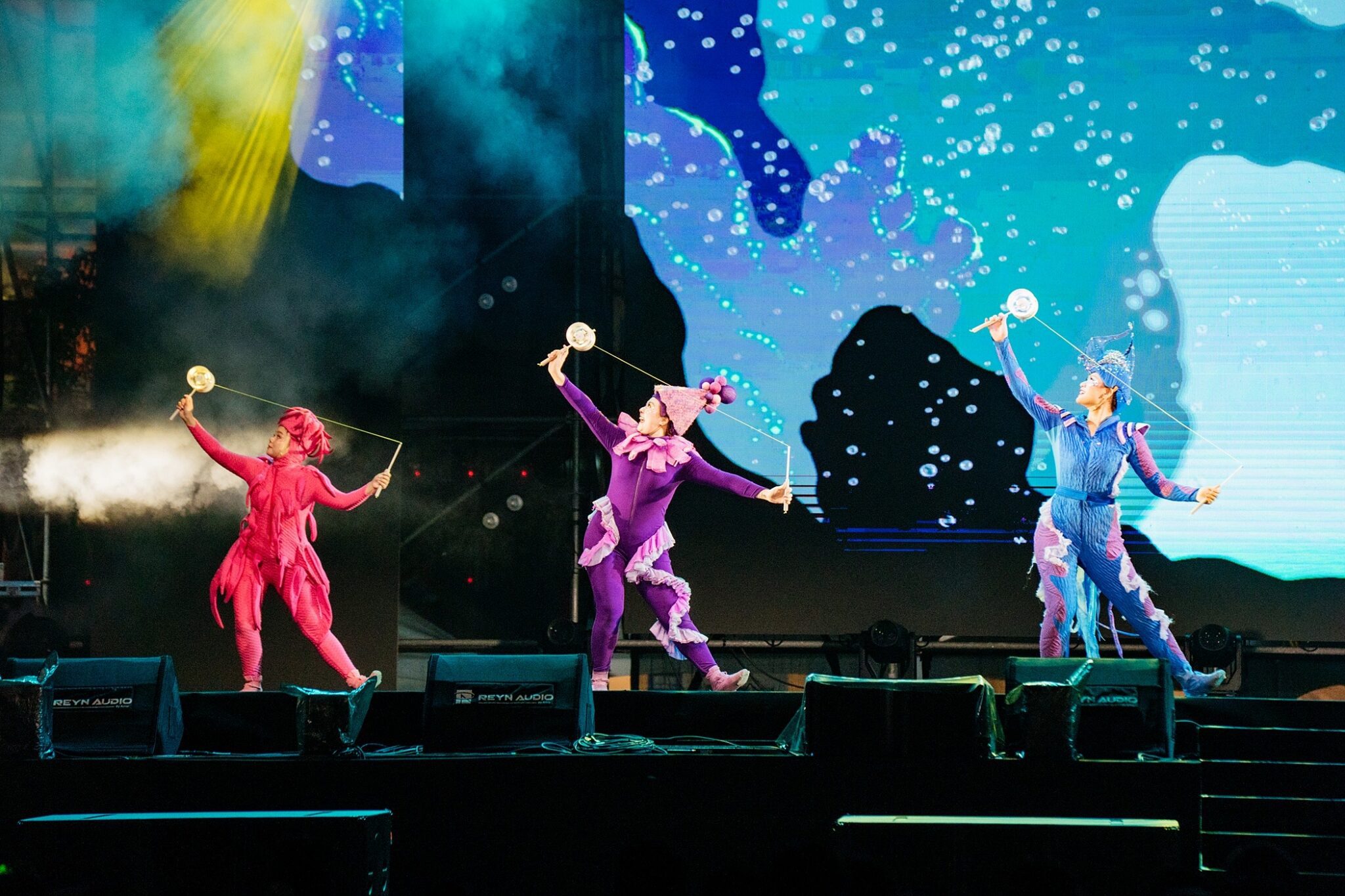 舞鈴劇場獨步全球的「舞鈴(Diabolo Dance)」成為全場最大亮點,飛舞的扯鈴在燈光、音樂與影像交織下,於舞台上劃出如流星雨般的光影軌跡,彷彿展開一片夢幻星空。整場演出無需語言,卻能跨越年齡與文化界線,讓不同世代的觀眾都能以最純粹的感官,感受表演藝術的力量。
