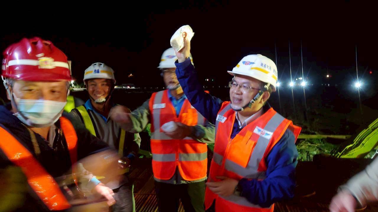 昨(2)日晚間,交通部政務次長陳彥伯率公路局總工程司陳進發、東區分局長林文雄前往工地現場,親自送上肉粽、刈包、麵包與飲料,慰勞日夜搶修的工班人員。他感謝團隊在11月29日即完成便道搶通,並期許大家持續努力,以115年1月底完成鋼便橋施工為目標,讓用路安全再提升,協助在地民眾早日恢復正常生活。