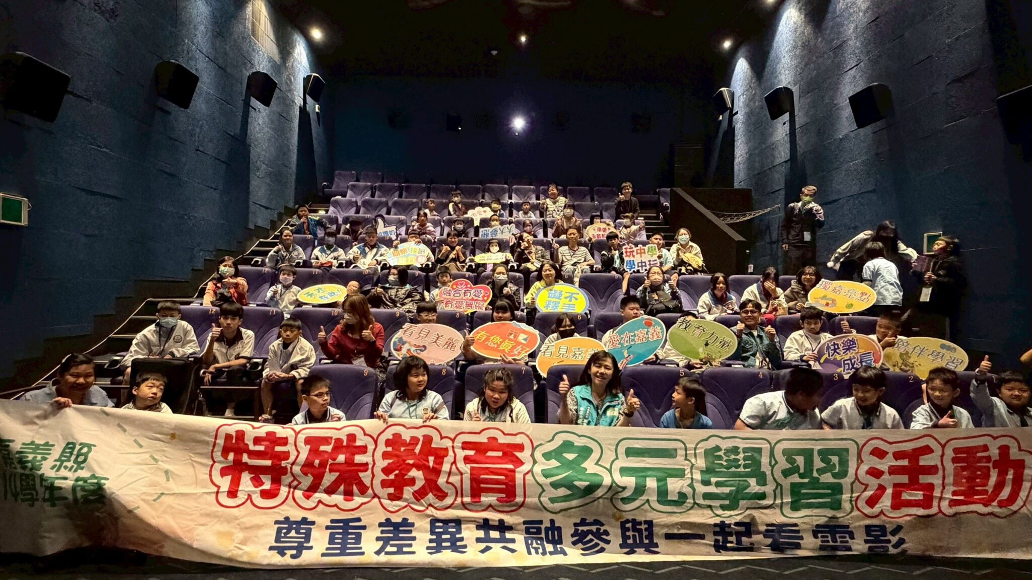 嘉義縣政府12月8日、11日舉行兩場次114學年度特殊教育多元學習活動計畫「尊重差異,共融參與-一起看電影」系列活動,約1,200位國中小師生參與,鼓勵特殊需求學生與他人互動、增強社會連結,包括副縣長劉培東、教育處副處長顏廷育、學特科長李育珊出席陪同。縣府攜手嘉義秀泰影城股份有限公司、台灣華特迪士尼股份有限公司及財團法人聯發電氣研究發展教育基金會,盼透過活動建立特殊需求學生公共場所安全逃生與合宜行為觀念外,也在輕鬆的氛圍中接觸多元議題,提升理解與表達能力,增進同儕互動深化社會連結。