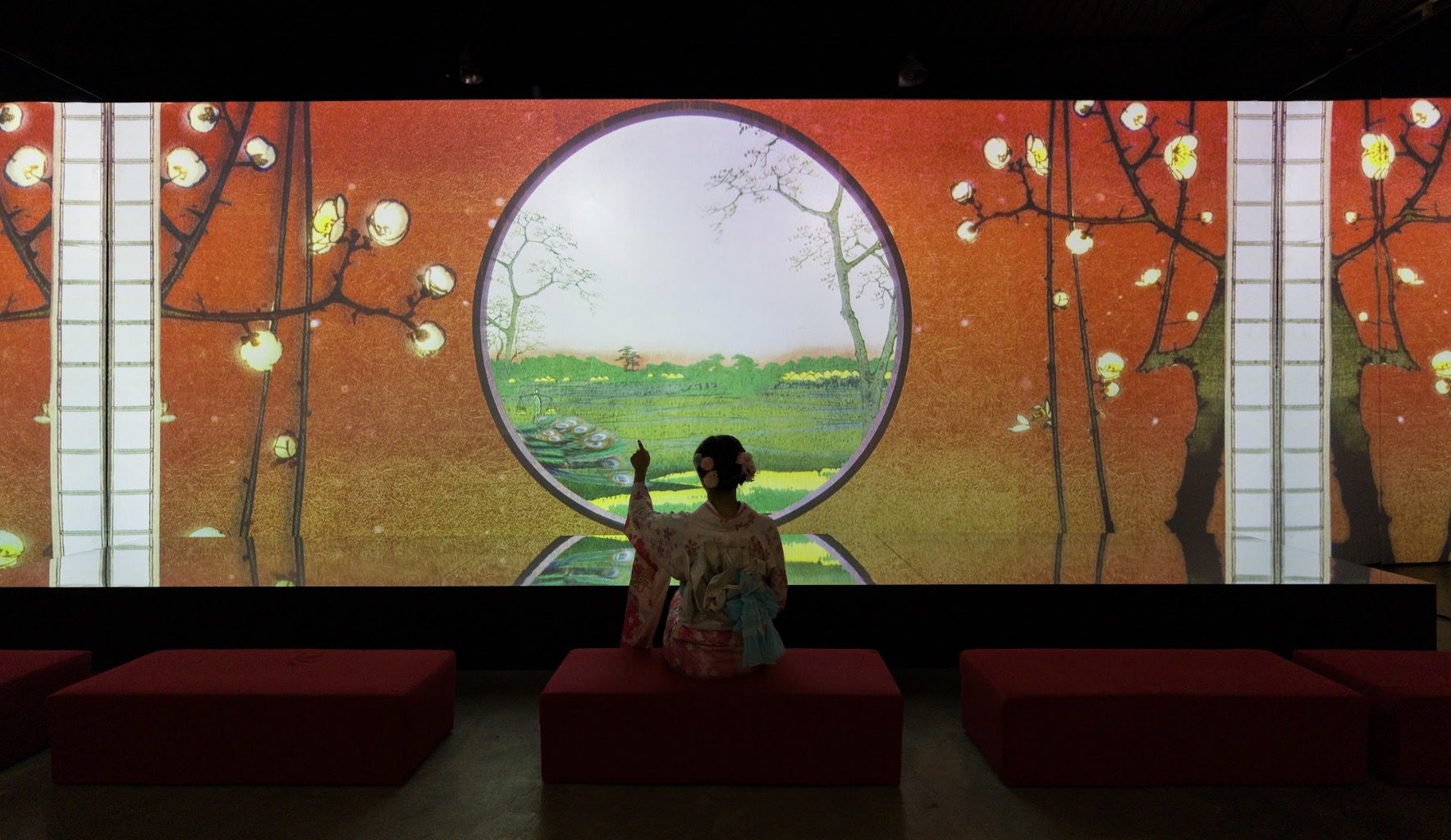 以數位影像轉譯經典名作,讓浮世繪從平面版畫延伸為流動場景,觀眾不再只是站在畫前觀看,而是被畫面包圍、彷彿親身走入江戶時代。