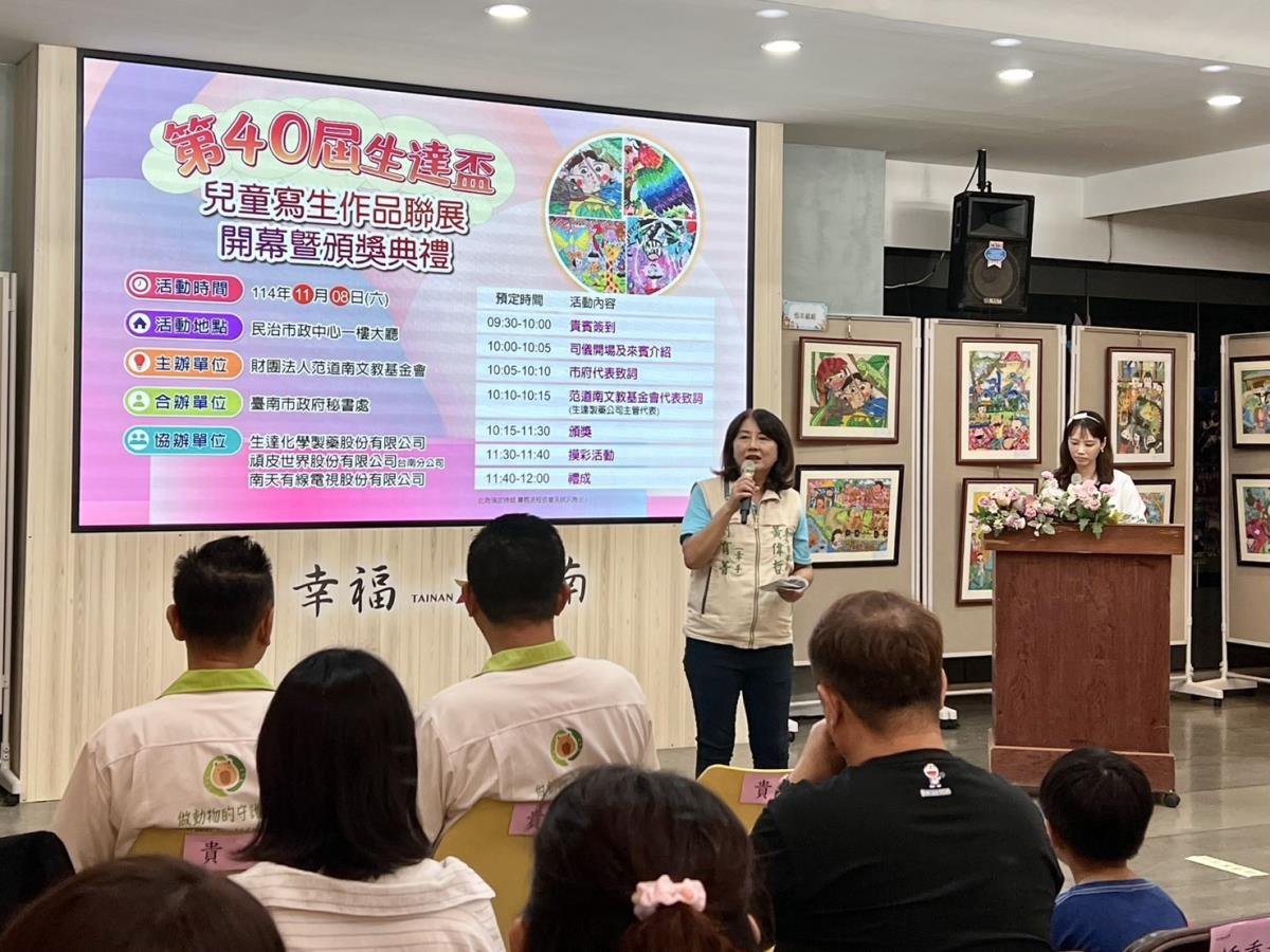 代表市長黃偉哲出席的劉育菁老師在頒獎時分享她多年的教學經驗,她觀察到喜愛繪畫的孩子往往具有敏銳的觀察力與無限創意。這次得獎作品色彩豐富鮮明,人物與動物表情生動活潑,充分展現純真的童趣。劉老師也歡迎民眾把握機會,前往市府民治市政中心一樓展覽大廳欣賞展出至11月底的優秀作品。