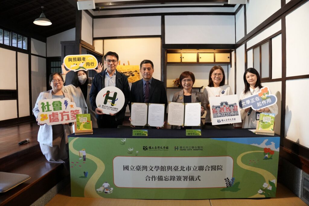 【記者蔡富丞/綜合報導】國立臺灣文學館致力開發「臺灣文學處方箋」,26日於臺北據點──臺灣文學基地與臺北市立聯合醫院簽署合作備忘錄(MOU),雙方將攜手合作,結合文學與健康領域,為社會大眾創造更具意義的文化及健康福祉。簽署儀式由國立臺灣文學館陳瑩芳館長、臺北市立聯合醫院副總院長王懋哲代表雙方機關,臺文館臺北分館黃蘭燕主任、北市聯醫失智症中心劉建良主任、梁穎瀧組長等共同見證。簽署儀式上,雙方代表就未來合作方向進行了深入交流,並共同期許文學與健康的結合能為社會帶來更多正面的影響。