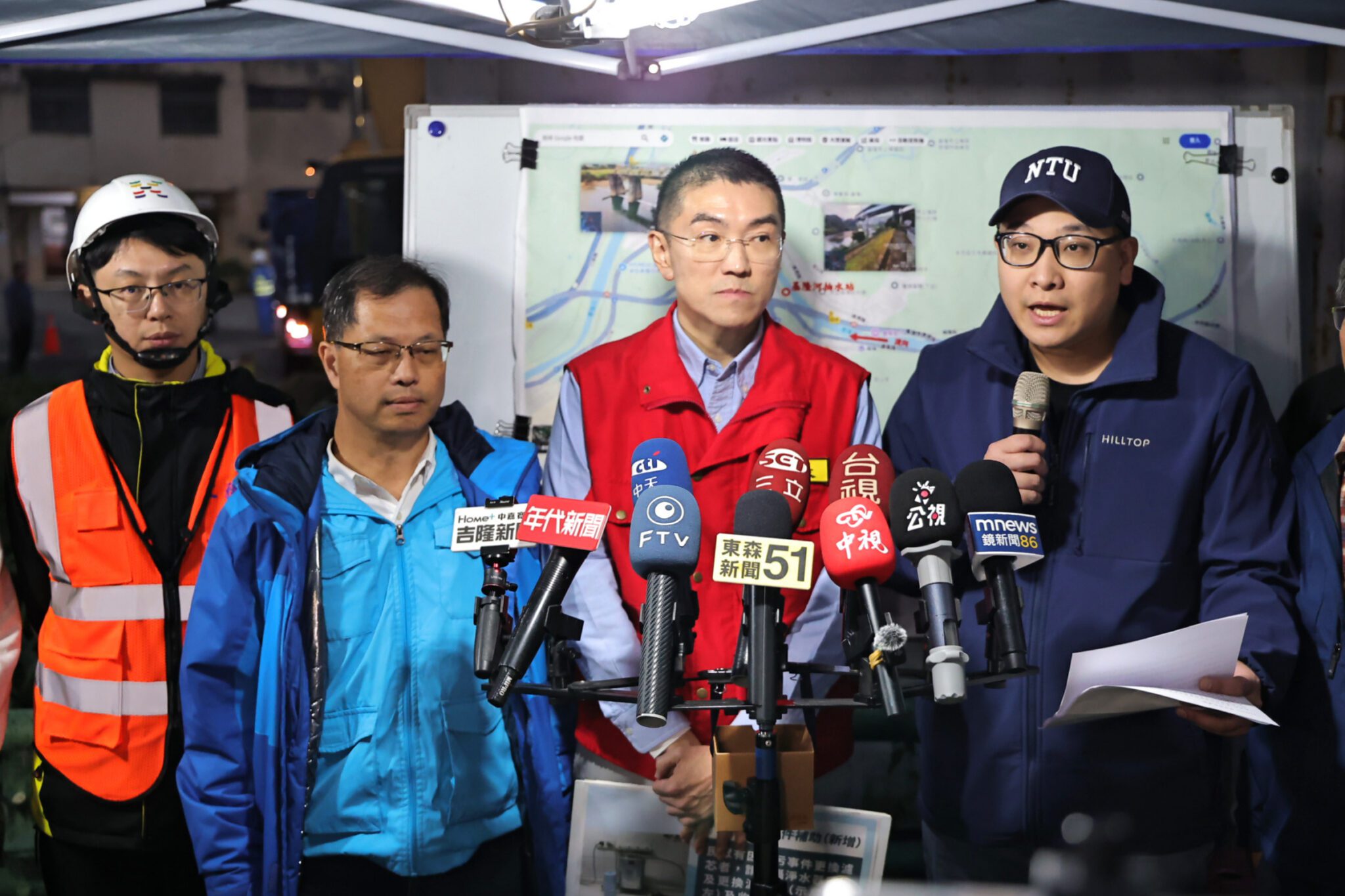 基隆市長謝國樑今(3)日晚間再次前往碇內前進指揮所現場,與自來水公司總經理李丁來、環境部簡任技正簡良達及市府相關單位共同勘查污染整治進度,並宣布因應自來水污染事件,市府補助項目將新增「濾芯更換費用」,協助受影響市民降低生活負擔。