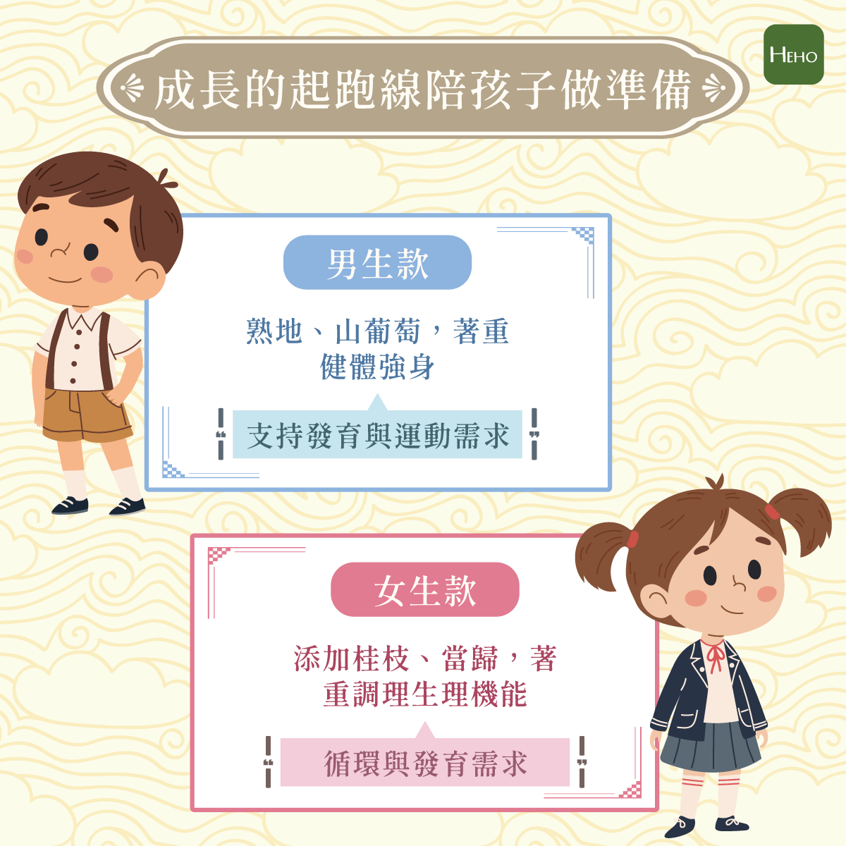 「轉大人滴雞精」的設計理念,正是針對不同性別需求調配成分:男生款偏向補給提振體力,女生款則以溫補與循環調理為主,幫助孩子全面調理補足成長能量。