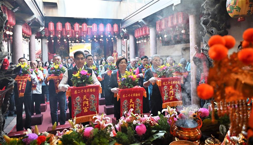 「2025彰化縣媽祖祈福文化節」活動來到第三天,於23日下午在社頭枋橋頭天門宮舉行聯合祈福典禮,並在社頭枋橋頭天門宮、田中乾德宮、北斗奠安宮、埤頭合興宮、二林仁和宮、芳苑普天宮、王功福海宮、鹿港台灣護聖宮、伸港福安宮、彰化南瑤宮、芬園寶藏寺、員林福寧宮、溪湖福安宮13間媽祖聖駕前,向媽祖神尊擲筊請示爐主宮廟,參加擲爐主宮廟經彰化縣長王惠美擲筊請媽祖賜杯,結果由芳苑普天宮獲得2個聖杯,接任2026年新爐主,「2026彰化縣媽祖祈福文化節」將由爐主宮廟擇定擲筊日期後,請媽祖賜杯決定辦理日期,13間宮廟神尊明年活動當日將再度集結於爐主宮廟。