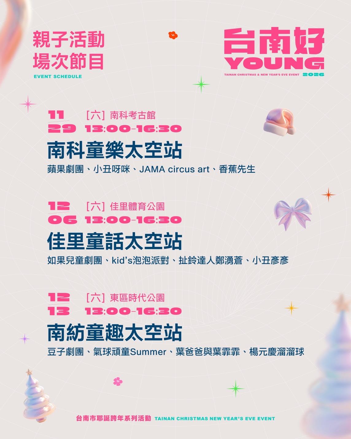 主辦單位新聞及國關係處表示,台南耶誕跨年演唱會卡司,不論是精彩度或是吸睛度,可以稱得上是全國數一數二且CP值最高,而「2026台南好young」耶誕跨年系列活動,除有3大演唱會,同時安排有南科考古館,佳里體育公園以及南紡時代公園等3場親子活動,如「豆子劇團」、「蘋果劇團」、「如果兒童劇團」等表演,並結合闖關遊戲,提供老少咸宜的娛樂選擇,誠摯歡迎全國民眾來台南追星、走走逛逛、吃美食,感受台南深厚的文化底蘊與獨具特色的小吃飲食。