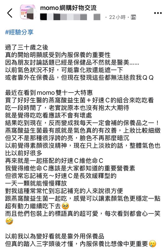 進入三字頭後,許多消費者開始重新檢視日常生活習慣,從作息、飲食到保養方式,都成為社群討論的熱門話題。近日在臉書「momo網購好物交流社團」中,就有網友分享自己年末購物清單時,提到入手 好好生醫燕窩酸益生菌 與 好速C維他命C,引發不少30+族群留言互動。