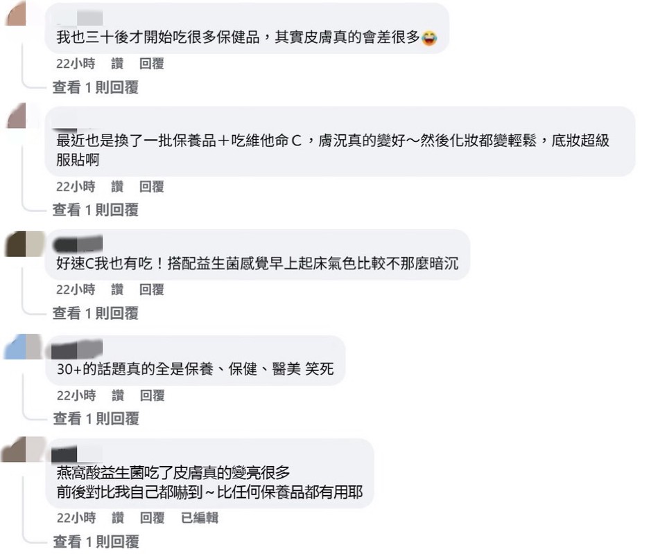 社團內也掀起不少共鳴聲音。有網友留言表示,三十歲後開始更關注各種保養相關資訊,單純是希望生活過得更有秩序;也有人分享,自己會依不同階段調整保養與飲食選擇,當作一種生活管理方式。更有網友笑說,現在的社群話題幾乎離不開「保養、保健、醫美」,已成為同齡之間的共同語言。