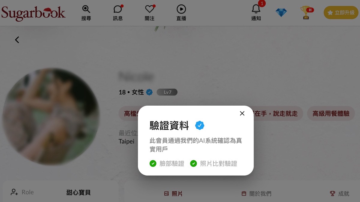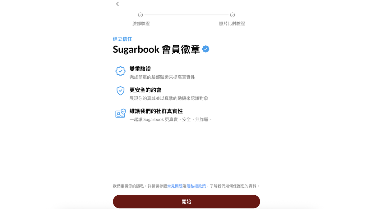 本(11)月中 Sugarbook 正式上線的新驗證機制,則是在原有的「真人驗證系統」上建置第二階段的「照片比對機制」,用戶需上傳一張「驗證照片」,由系統比對該照片與通過「真人驗證」的人像是否為同一人,以確保帳號的真實性與一致性。兩道驗證程序皆通過後,才會在帳號旁顯示平台的「已驗證」徽章。