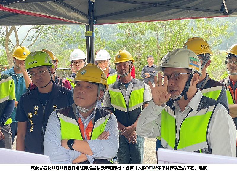 為因應鳳凰颱風逼近可能帶來的災害,農業部農村發展及水土保持署陳署長俊言於114年11月11日親自前往南投縣信義鄉明德村,視察「投縣DF185保甲林野溪整治工程」進度,並拜訪信義鄉公所與水里鄉公所,了解地方土石流防災整備情形,確保坡地與居民安全。