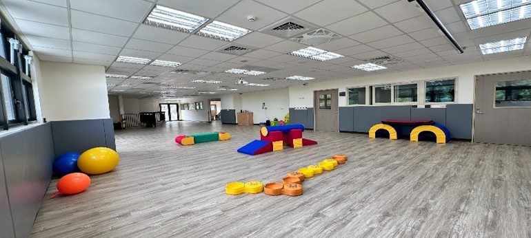 萃湖非營利幼兒園位於文山區興隆社會住宅E區內,園內設有腹地廣大的幼兒專用室內遊戲活動區,讓孩子能放心地「爬、走、跑、跳」,也能在「拋、接、丟、投」中發展手部協調與專注力。
