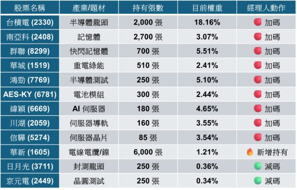 除了AI題材,00991A也緊跟其他產業趨勢脈動,從最新持股變動發現,上週大舉買進華新(1605)6,000張,研判主要是著眼銅價上漲以及電網強韌計畫與電動車鎳材商機;搭配另一檔續抱的重電股華城(1519),形成「綠能與基建」的衛星持股組合。這種透過主動研究靈活部位的操作,展現了攻守兼備的策略,後市表現值得投資人高度期待。