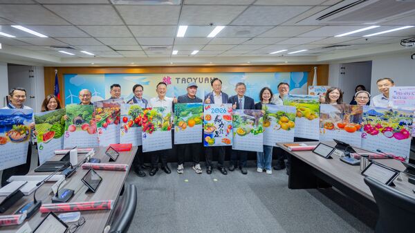 桃園市長張善政12日下午於市政會議前,率領局處首長及2026桃園農產月曆設計總監蕭青陽共同宣傳「2026桃園農產月曆」。張市長表示,去(113)年推出的「蛇馬龍舞」月曆廣受歡迎,今(114)年農產月曆主題是「馬力食足」,再度邀請蕭青陽老師操刀,以藝術結合農業為核心,透過全新視覺設計展現桃園農業之美。