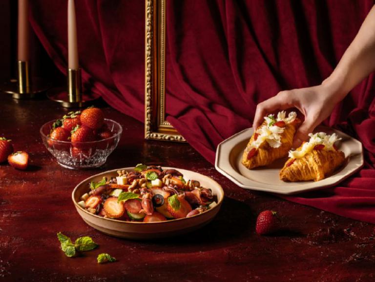 潮韻】以草莓風味巴薩米克醋膏搭松葉蟹的開場前奏,到【鮨影】草莓干貝莎莎最中餅與拉斯帕起司莓映壽司的和風交融;【綠宴】的兵庫螢烏賊草莓沙拉與起司雪花草莓可頌,酥脆可頌夾入輕盈如雪起司與新鮮草莓,展現冬季法式自然。【炙曦】的爐烤香草豬肋排佐草莓多蜜醬、炙烤乳酪草莓干邑松阪豬;再到【炙境】的草莓松露火腿牛肝菌麻花捲麵與莓果陳酒韓式炸雞,【酌光】草莓栗香蒙布朗與草莓晨露銀耳、【瑰彩】草莓花園法式塔、草莓雲朵奶酪、草莓玫瑰旅人蛋糕、草莓生乳捲及草莓大福等七款草莓甜點,場場皆驚艷,款款皆打卡焦點。