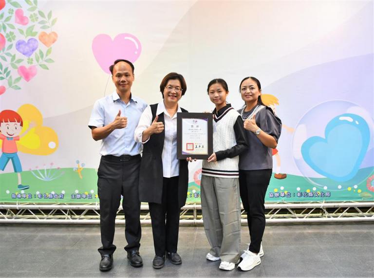 ▲鹿港國中黃同學從小學開始持續參加「童畫心世界畫展」,變得更有自信,縣長王惠美除表揚黃同學外,也感謝每位辛苦的師長與家長一路上的陪伴與鼓勵,孩子們才能安心成長,勇敢表達自己。(圖╱記者孔亮云翻攝)