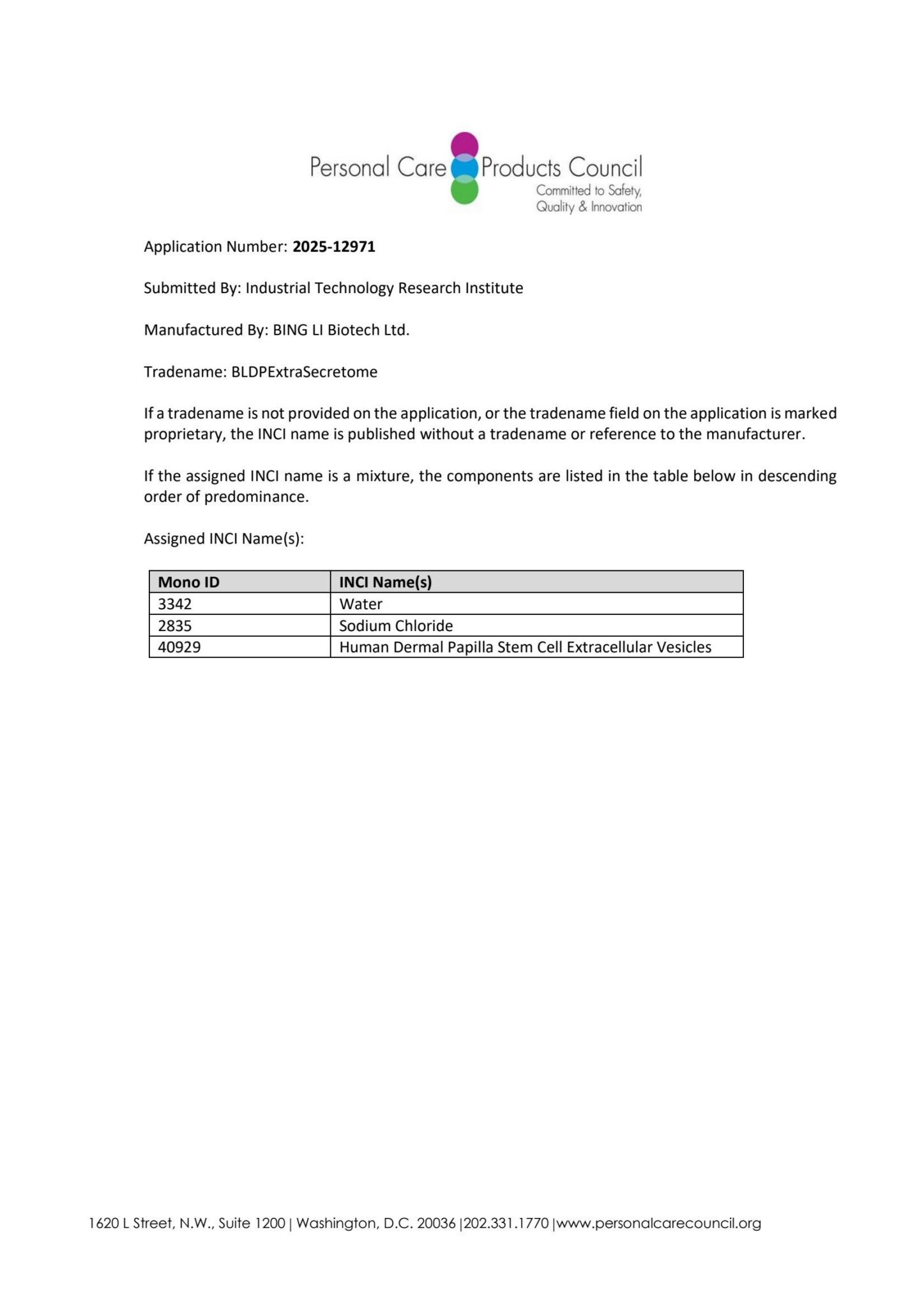秉秝生醫(BING LI Biotech Ltd.)以人類真皮乳突幹細胞衍生物(ExtraSecretome,胞外體)於今年 6 月遞案提交國際化妝品命名委員會(International Nomenclature of Cosmetic Ingredients, INCI)進行定審,並於 11 月初成功登錄於美國化妝品個人護理品與香氛協會(Personal Care Products Council, PCPC)所制定的《國際化粧品原料字典和手冊》,取得 INCI Monograph ID: 40929。秉秝生醫也因此成為台灣第一家以人類真皮乳突幹細胞衍生物取得 INCI 登錄的企業。