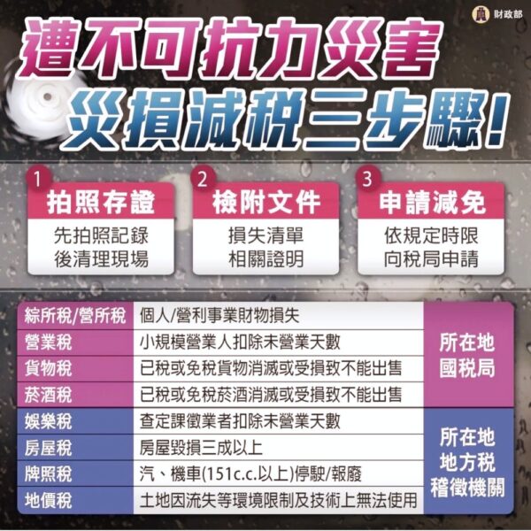 ▲災害捐失申請稅捐減免三步驟。(圖/竹北國稅局提供)
