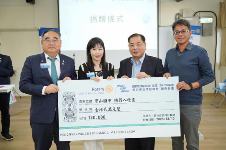 國際扶輪3501地區新竹世博扶輪社今(10日)在寶山國中舉辦「世博育才-智慧展能」偏鄉機器人教育設備捐贈儀式,新竹縣副縣長陳見賢、國際扶輪社3501地區總監劉正輝及新竹世博扶輪社長徐婉容等一同出席,扶輪社贊助寶山國中機器人教育設備經費12萬元,縣府也加碼挹注機器人教育教材及教師培訓經費7萬6千元,讓孩子對機器人教育發展更加多元,並增加孩子站上國際賽事的機會,拓廣AI領域。